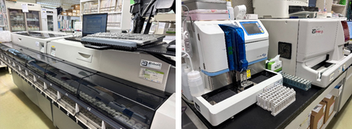 採取された血液や尿などの体液に含まれる成分を、自動分析装置を用いて検査しています。