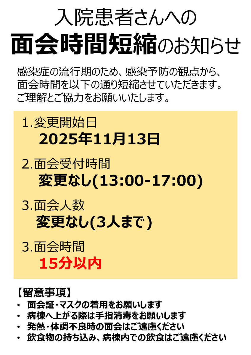 2025年11月13日より面会時間が下記の通り変更となりました。