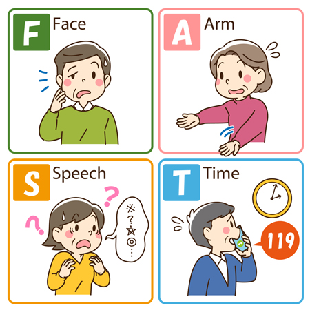 突然の片側手足の麻痺、顔がまがる、言葉が出ないなど、脳卒中を疑う症状が出たら、様子を見るのではなく、すぐに救急車を呼び、少しでも早く受診してください。