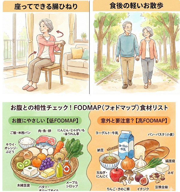 【食事②:意外な落とし穴? 最新の「相性」チェック】 ここで新しい視点をお伝えします。「体に良いはずの納豆やヨーグルトで、逆にお腹が張る」という方はいませんか? 実は「FODMAP(フォドマップ)」と呼ばれる発酵性の糖質が、体質によってガスや下痢、お腹が張る原因になることがあります。 栄養価が高くても、自分のお腹に合わないことがあります。もし食後の不調が気になる場合は、特定の食品を控えてみて体調の変化を観察するのも一つの手です。